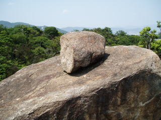 | Google Maps:04三国岩 三国岩 (三石岩) 餅を斜めに三枚重ねたような形が印象的である。この岩の上に立てば、摂津、播磨、淡路の三国が見渡せることから、三国岩(みくにいわ)の名がついたと言われる。 荒深氏によると、この岩は南磐座で、このすこし北の川西邸内に三つの石からなる北磐座がある。 場所:六甲山頂、三国池近傍 |