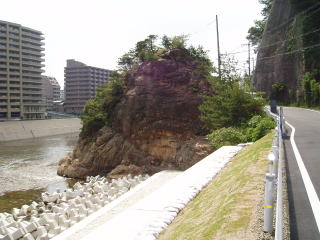 | 見返り岩 農閑期に武庫川上流の土地から湯治にやってきた人が宝塚を後にする時、何度も振り返って見ることからその名がついたといわれる。 昔は振り返りたくなるような岩も、今は道路が岩を切り裂いてさっぱりだ。これも磐座とのことである。 場所:宝塚の生瀬橋の少し下流 |
