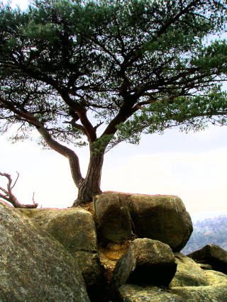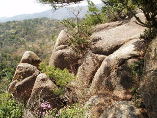 | 岩の上にすっくと立つ赤松は、いつ見ても雄々しく、見る者に生きる勇気を与える。 松の根方に腰を下ろし、六甲の山々をゆったりと眺める気分は最高だ。 |