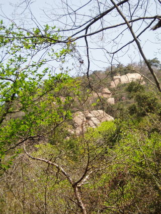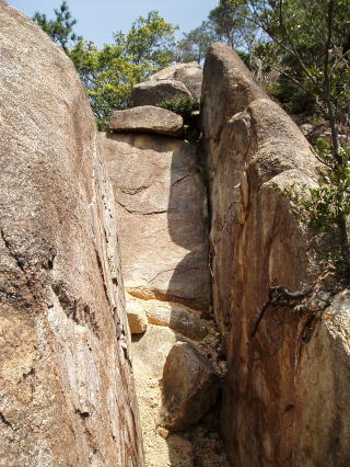 | 登り口から見た岩穴 | 岩穴を抜けたところ、ロープをたらしてある | |