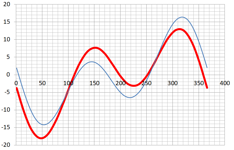 横軸(細線):AD2000年12月21日冬至を第1日とする通日(1日~366日)