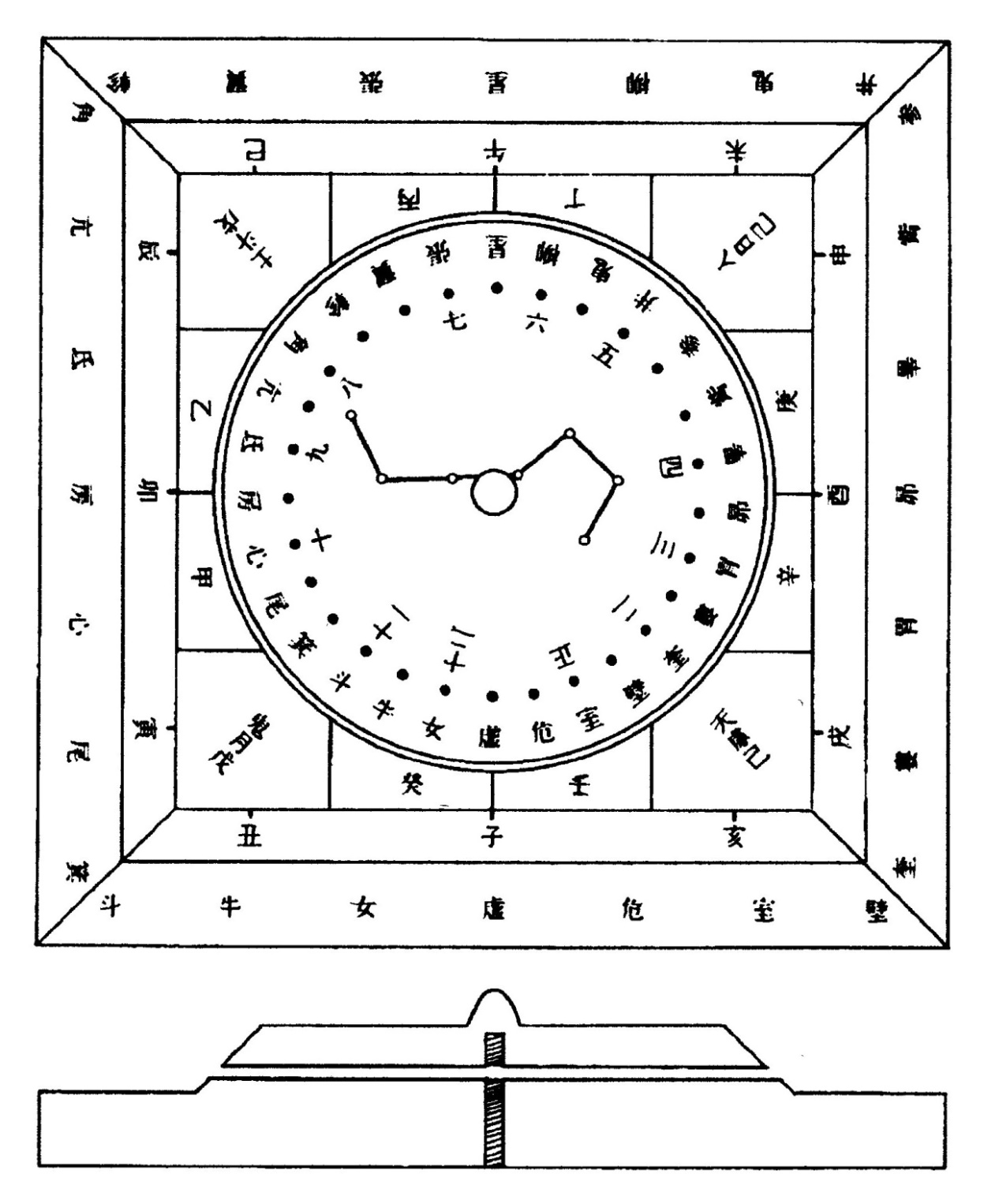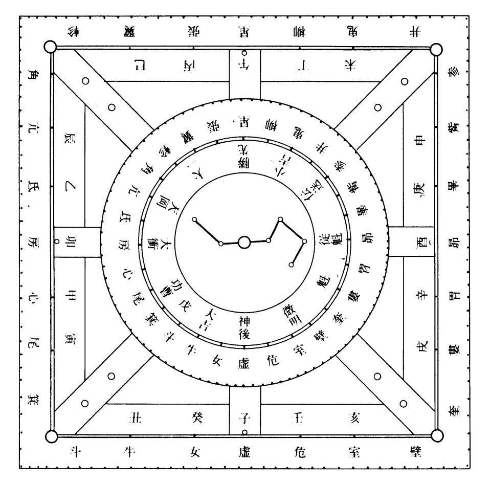 天盤の上半部にその月日の古代中国における一日の始まりである夜半(午前0時)に展開している二十八宿が表示される。