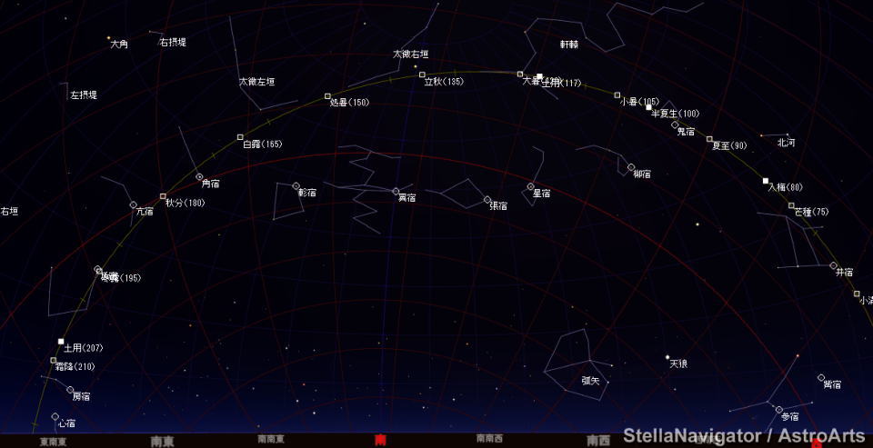 5 二十八宿のシミュレーションは天文ソフト:ステラナビゲータ10(アストロアーツ)、計算とグラフはエクセルを使用する。