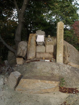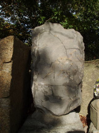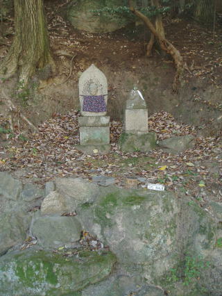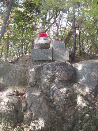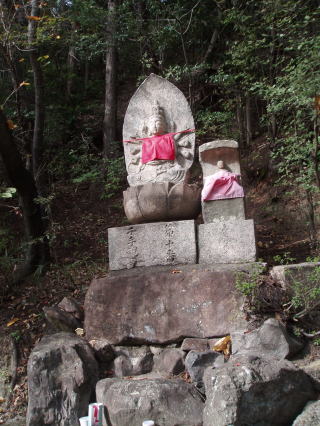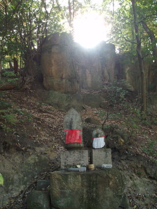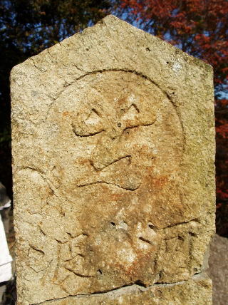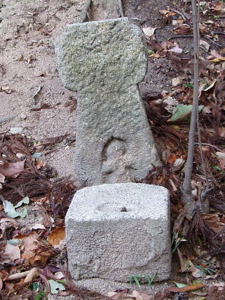 | 地蔵菩薩を表す梵字「イー」である。 | 人がたの奇妙な石像、裏六甲の多聞寺にこれと似た石像があることから、これは羅漢と推定される。 | |
