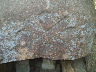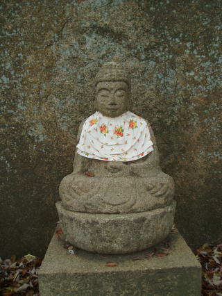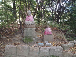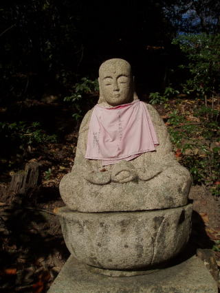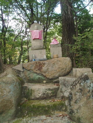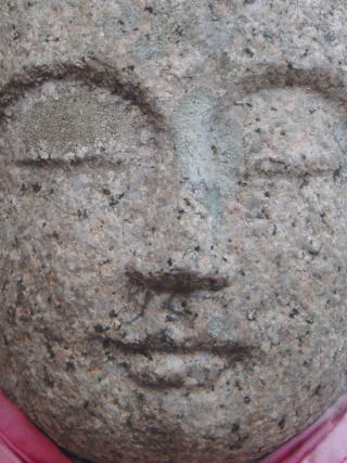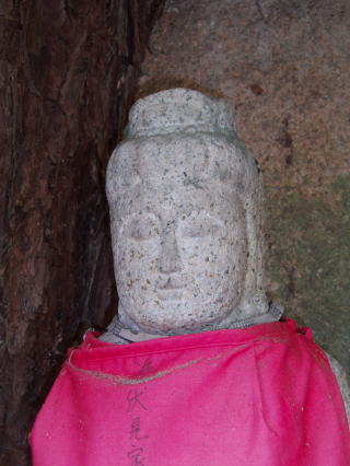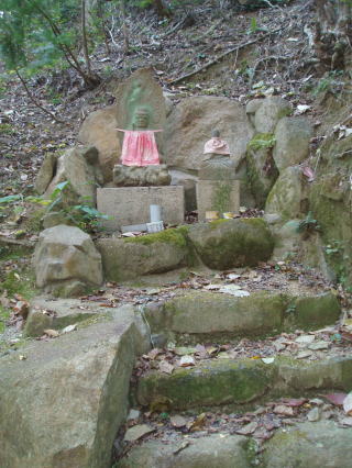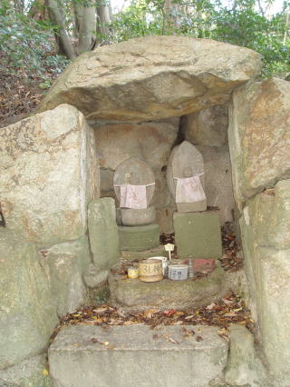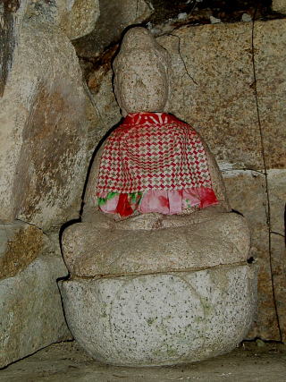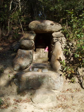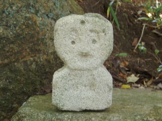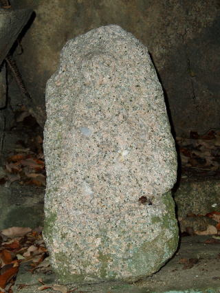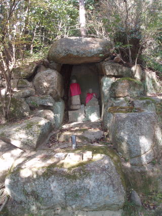 | 石の御堂の天井の石の正面に刻まれた紋、長曾我部の家紋ではない。建立寄進者の家紋? | 第二十番にもあった人形。 これは、多聞寺の例から羅漢と推定される。 |