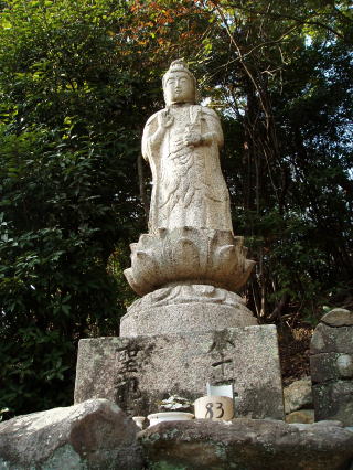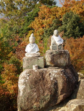 | 第八十二番 根香寺 (ねごろじ) 金剛界曼荼羅の五智如来は、大日(中心)・阿閃(東)・宝生(南)・阿弥陀(西)・不空成就(北)である。この五仏を感得した弘法大師は、この地が密教にふさわしいとして山々に青峯、黄峯、赤峯、白峯、黒峯と命名した。曼荼羅の文献によれば、色と仏には密接な関係があり、青は不空成就、黄は宝生、赤は阿弥陀、白は大日、黒は阿閃に対応する。 また、五つの峯は五色台と総称され、根香寺は青峯山、白峯寺はその名の通り白峯山にある。 本尊:千手観世音菩薩 詠歌 宵の間のたえ降る霜の消えぬれば あとこそ鐘の勤行のこえ 注 この祠には、神呪寺の第八十三番の表示があるが、第八十二番の誤りと思われる。 神呪寺の第八十二番の表示のある場所は、弘法大師の石仏が二体安置されているのみであり、本尊がない。 また、第八十三番は自動車道を北に渡ったところにもあり、これが本当の第八十ニ番である。 |