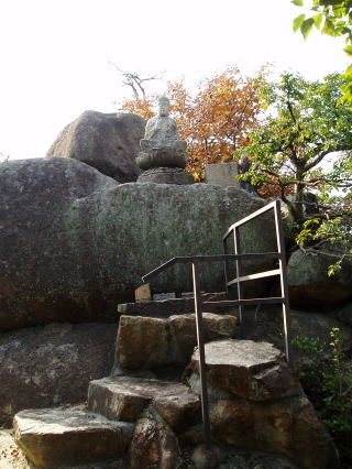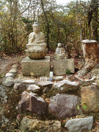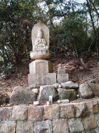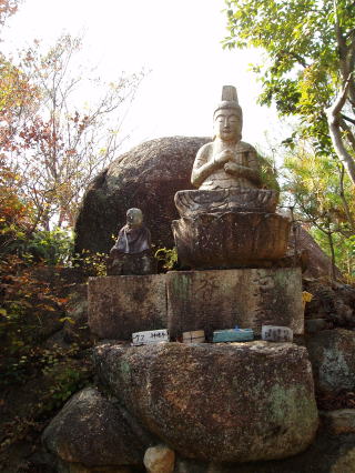 | 第七十三番 出釈迦寺 (しゅっしゃかじ) 出釈迦寺の奥の院のある我拝師山の頂上には、七歳の弘法大師、幼名 真魚(まお)が、「仏道に入り、衆生を救わんとする我が願い、成就するものならば霊験を、さもなくば賭したこの身を諸仏に捧げん」と念じて身を投げた断崖絶壁がある。身を投げた大師は、紫雲と共に現れた釈迦如来と天女によって抱きとめられたという。 本尊:釈迦如来 詠歌 迷いぬる六道衆生すくわんと 尊き山に出ずる釈迦寺 石仏の調査 「神呪寺八十八箇所調査報告書(西宮市文化財資料第四十二号)」によると、『石仏は薬師如来』とあるが、薬壷が左手に載っていないこと、薬師三界印でないこと、江戸時代(寛政)以降の作であること等から薬師如来ではなく釈迦如来と推定される。 |