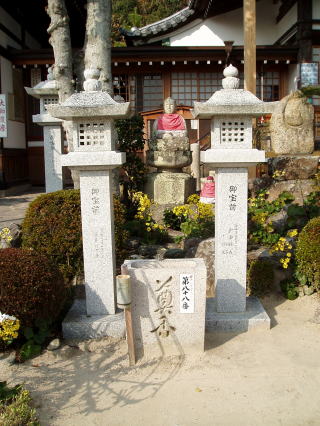 | 第七十七番 道隆寺 (どうりゅうじ) 創建時の薬師如来を胎内仏に弘法大師が刻んだ薬師如来は、京極左馬造の幼少の頃の眼病をなおしたことから、「眼なおし薬師」と呼ばれ親しまれている。京極左馬造は、道隆寺の薬師如来の信仰により眼病が快癒したことから医学を志し、後に丸亀藩のおかかえ医となつた。本堂西の潜徳院にある京極左馬造の墓所には、「め」の字を書いた眼病祈願の札が多数奉納されている。 本尊:薬師如来 詠歌 ねがいをば仏道隆に入りはてて 菩提の月を見まくほしさに |