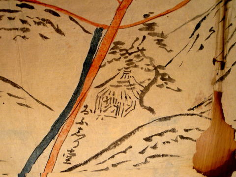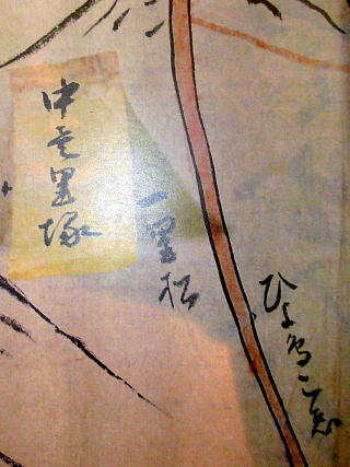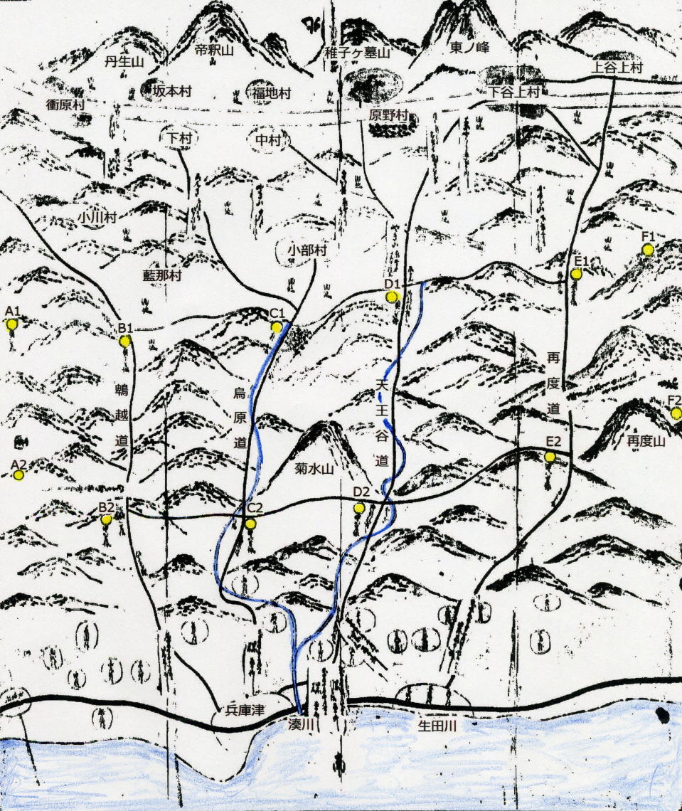 ・「志」と「於」は、「し」と「お」の変体がな ・「うつぼ志いの木」の「ぼ」は、原図では変体がな「ほ(本)」に濁点の表記である。 ・「こう志ん堂」の「こ」は、原図では変体がな「こ(古)」の表記である。 ・第3種絵図の中一里塚の一里松のところには、松の木の絵がある。 <推定根拠> 推定にあたっては、第一に表1の絵図の情報、第二に現在の中一里山の境界、 第三に大蔵省境界図(文献2①)、第四に山論にかかわる事件や伝承を勘案した。 中一里山の境界については、ネット地図Mapionを使用し、 境界と鵯越道、烏原道、天王谷道、再度道との交点を参考地として求めた。 塚B1 絵図に「うつぼ志いの木(うつぼ椎の木)」とある。 「うつぼ」は空洞、空洞のある椎の巨木と想像される。 Mapion地図から得られた境界で、星和台の南あたり。 塚B2 絵図に「一里松」とある。塚に植えられた松であろう。(図2) Mapion地図から得られた境界で、神戸電鉄鵯越駅のある里山町あたり。 里山町周辺には中一里山があるため、これが町名になったといわれている。(文献7) ![]() 図2 「ひよ鳥こゑ」の一里松(鵯越道 中一里塚B2)(文献5) 「中壱里塚」の符箋が貼られている。 塚C1 絵図に高い松と御堂が描かれ、「おふ志り堂(小部尻堂)」とある。(図3) 別の絵図(図1B)から、この御堂が庚申堂であることがわかる。(表1参照) Mapion地図から得られた境界で、小部尻にある一本松であろう。 大蔵省境界図に「一本松塚」がある。 一本松は烏原街道にあって、日本三大松と呼ばれた。(文献8①) 絵図には塚が描かれていないことから、この一本松自身が塚としての役割をはたしていたと思われる。 まさにランドマークである。 ![]() 図3 松の木がある小部尻堂(烏原道 奥一里塚C1)(文献5) 塚C2 絵図に「一つ橋」とある。烏原谷の入口あたりと思われるが詳細位置は不明。 Mapion地図から得られた境界で、烏原町の北あたり。 『神戸歴史物語』(文献8②)には、慶長九年十二月一日に、この下の住蓮坂で起こった山論がらみの事件の記述がある。 塚D1 絵図に「杦ノ木(杉ノ木)」とある。 Mapion地図から得られた境界の北、二軒茶屋の南に字杉ノ木(文献9①)がある。 絵図の塚D1と塚E1を結ぶ境界が、天王谷川とクロスする地点としても妥当である。(図1C) 大蔵省境界図にも「杦木塚」がある。 また、『山田村郷土誌』(文献10①)には、「一本松から二軒茶屋へ見通す線が小部と下谷上字中一里山との境界線」とある。 塚D2 絵図に「かうざ(高座)」とある。 「かうざ」は天王谷道(有馬街道)にある兵庫区平野町の高座にあたる。 大蔵省境界図にも「高座塚」がある。 塚E1 絵図に「柿の木畠」と記載がある。(図4) 「柿の木畠」は、北区下谷上の字柿木畑(カキノキバタ)(文献9②)にあたる。 現在の神戸市立森林植物園の園内北部が柿木畑である。 この地は、柿木塚と呼ばれ一般の地図にも掲載されているが、塚の有無や慶長の絵図とのかわわりについては別途検討を要する。 ![]() 図4 柿の木畠(再度道 奥一里塚E1)(文献5) 「奥壱里塚」の符箋がはられている。 塚E2 絵図に「よこ於(横尾)」とある。 この横尾については、神戸市文書館蔵「中山境堺字野香半国岩より大津木ノ山迄(間数覚)」(明治時代)(文献5)の中に、 「再度山ウラノ横尾」とある。表題の「大津木ノ山」は、菊水山の古名である。 これらから、Mapion地図から得られた境界で、再度山の裏手にあたる再度越の北あたりとなる。 大蔵省境界図にも、「口横尾塚」が再度山の西にある。「口」は口一里山を意味する。 これらから慶長絵図の塚の位置は多少のズレはあるものの、現在の中一里山の境界に合致しているといえる。 また、奥一里塚において鵯越道が椎、烏原道が松、天王谷道が杉、再度道が柿というようにそれぞれ樹木であることも興味深い。 6 東部境界の一里塚(塚F1~F2) 第3種絵図(図1C)には塚F1、F2両者の記載があるが、 第1種絵図(図1A)は塚F1の記載がなく、第2種絵図は塚F1、F2両者の記載がない。 塚F1とF2については、絵図に何の地名情報もなく、おまけに道も描かれていない。 従って、これまでとは別のアプローチが必要である。 享保十一年(1726)に八部郡福原の庄七ヶ村と菟原郡芦屋の庄三ヶ村との生田川の郡境と草山境界における山論において、 奉行所が出した裁許状(村上華岳氏所蔵)の中に次の文言がある。 「・・・文祿年中検地の節の古證文指出候。草山境は立岩より長尾谷塚まで限り、 地元丹生山田庄へ福原庄六ヶ村より山手米相納め候・・・ 享保十一丙午年十月十九日」(文献2③) 上記古證文は、福原の庄が裁判資料として奉行所に提出したものである。文中の草山とは、中一里山にある入会の山をさす。 この文中の「立岩」と「長尾塚」が鍵となる。 詳細については 関連調査報告 石楠花山の一里塚と生田川の立岩 を参照。 (1)生田川の立岩 立岩は、生田川上流のトェンティクロス高雄山ダムの右岸にある巨岩である。 生田川の立岩は、『再度山史話』の付図である神戸徒歩会会員用地図(図10)に登場