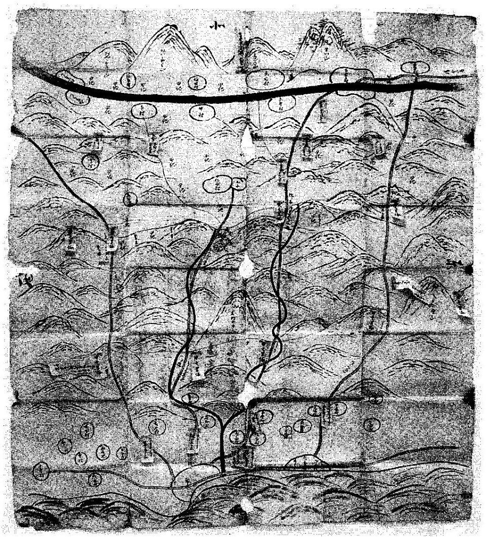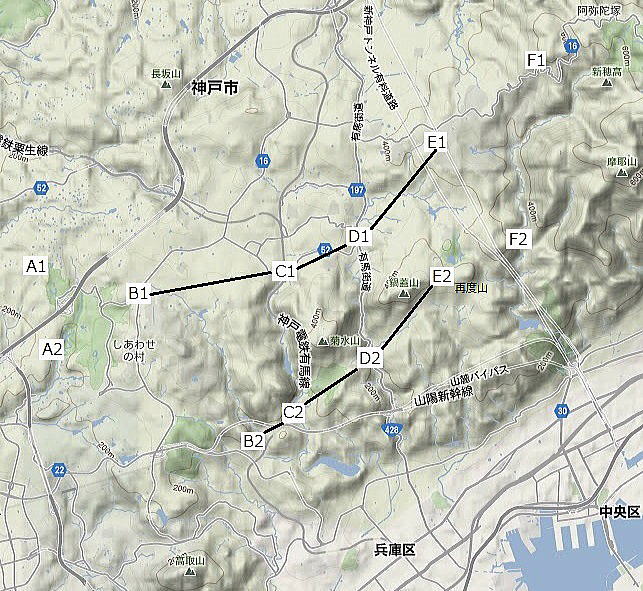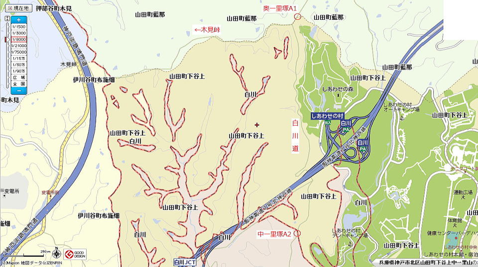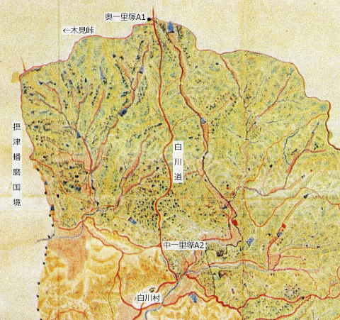| 慶長十年中一里山裁許絵図の一里塚について 1 はじめに 六甲山系の山論に関し、『神戸古今の姿』(文献1)に次のような記載がある。 市背連山に口、中、奥一里山の称あり。古来之を使用すれど初めて記録に現はれたるは慶長年中片桐且元の山論裁許状にあり。 此山論は神戸側の五十数箇村と山田村の権利争ひなりしが爾後二百五十年間に亘り解決を見ず。 日本に於ても稀有の山論たりしが、明治九年に至り遂に決定し、 一件始めて神戸側の勝利に帰し、中一里山は部落有財産となるに至れり。 口中一里山の境界は、東は六甲山の三郡境界たる半国岩、今の三石岩を東端とし、 西へ摩耶再度の頂上を経、有馬道の高坐、烏原谷の一ッ橋、鵯越の一里松、車村の善福寺峯に来り、 車村の大池、白川村の法眼堀切を経て播州堺に達する一線にして、中一里の奥に奥一里山あり、武庫郡山田村に属す。 (筆者注) 六甲山の三石岩は、今の三国岩。 車村の善福寺(原文は禅福寺とあるが誤りであろう)は、今の慶雲寺。 法眼の堀切は、白川村の摂津と播磨の国境を指す。辞典によれば、法眼(ほうげん)は僧の位とある。 尚、上記の境界は大蔵省所蔵『中一里山境界図』(文献2①)(以下「大蔵省境界図」と略称)によるものである。 「大蔵省境界図」の解説としては、奥中喜代一氏の『国際港都の生いたち その二』(文献20)がある。 中一里山の境界には一里塚と呼ばれる塚が点々と築かれた。その塚のあるものは慶長年中に遡るものがある。 本論文は、慶長十年中一里山裁許絵図に現れた塚の概略位置を推定したものである。 2 一里塚の由来 一里塚の名称の由来としては二説ある。 ひとつは距離によるもの、ふたつは条里制を起源とするものである。 距離説 距離説に関して、慶長九年(1604)の村田家文書に次のようにある。(文献3) 山田庄境争論山田庄惣中申上条々 ・・・山田より兵庫迄三里之内、くち一里者兵庫在々の領内、おく二里ハ山田庄領内にて御座候、 然処中一里之分兵庫其外在々へ山手ニ相定売申候、・・・ 慶長九年十二月七日 山田庄惣中 上記の文書に基づき、神戸電鉄谷上駅(下谷上村)と兵庫区和田岬(兵庫津)までの直線距離を測ると、 約3里(12㎞)となりそれなりの説得力はある。 条里制説 奈良朝の条里制は条と里を碁盤の目のように区切り、条と条の間、里と里の間を一里(六丁)とした。 さらにその正方形の区画を一丁四方に三十六分割し、その小区画を坪と呼称した。 それは、摂津国八部郡何庄何条何里何坪というように住所としても用いられた。 神戸地方の条里制は、里は北より南へ一里・二里と呼ばれ、各条の一里が横に連なっていた。 これを神戸側から口一里、中一里、奥一里と呼んだ。(文献2②) そして、口一里の北の境界が山田の庄と神戸側の境界となった。 いずれもなかなかの説であるが、現在のところ結論はでていない。 口一里山、中一里山の呼び方は、今も健在である。 例えば、再度山には境界が走り、南と北に区分されている。 南の大龍寺は、神戸市中央区神戸港地方口一里山再度山1、 北の再度公園は、神戸市北区山田町下谷上中一里山4-1である。 「神戸港地方」は「こうべこうじかた」と読む。 地方(じかた)とは江戸時代には都市部に対する農村の事を指したが、 明治時代に神戸港周辺部の山間部を指す地名として用いられた。 3 慶長九年の中一里山山論 慶長九年の中一里山山論ついて、『神戸市史』(文献4)よりその概要を紹介する。 近世の農民にとって、山野もまた堆肥を作るための下草を刈り、牛馬を養い、薪を拾い、木の実や山草を採取する場として、 農業生産のみならず農民の生活そのものを支える上で、重要な意味をもっていた。 そのため、山野の権益をめぐる村と村との争いは、近世を通じて頻発し、 とりわけ近世初頭には、農民間の激しい実力行使を伴うことさえあった。 慶長九年に起こった山田庄と兵庫・神戸近在村々との庄境入山をめぐる争論は、 十一月十七日山で柴を採取していた兵庫近在の者に対し、山田庄側が庄境を越えて入山しているとして、 鎌鉈を奪い、鞍を抑え、刈柴を焼き捨て、追い返したことに端を発している。 その報復に今度は福原庄側が主唱して、兵庫津へ通じる各道を抑え、 山田庄から運ばれる米・柴を阻止する実力行使に及んだため双方の衝突となり、重傷者を出す大事件となった。 山田庄側は奉行片桐且元(注)に出訴し、且元は十二月十四日、 制札を以て、中一里山への立入りを禁じ往来は通ずるよう命ずるとともに、 翌年一月より審理にかかるよう相手方福原庄関係者に手配した。 ところが、兵庫津と上庄ではそれぞれの代官の許可を得て入山したことから、再び山田庄側と衝突し、 十二月二十五日兵庫側は山田からの荷物を止め、 翌十年一月十一日山田側も兵庫から有馬への継立てを、箕谷の茶屋で妨害する事件が起こった。 そして同二十日、大坂へ双方の関係者が事情を上申し、取調べのうえ、 二月二日対決があって、紛争の当事者は