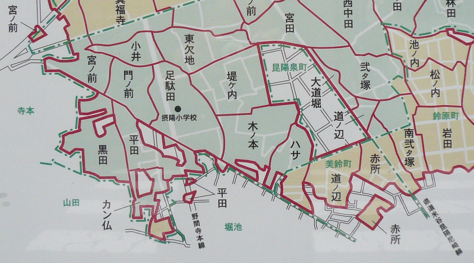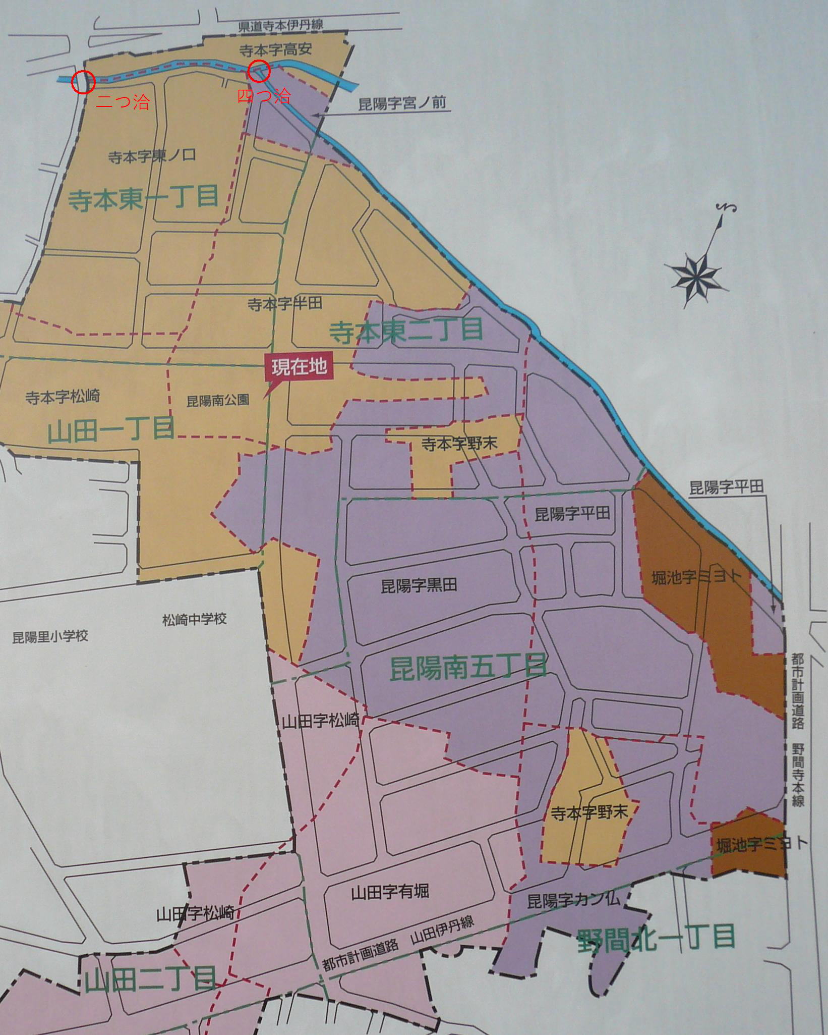 尚、四つ洽の正確な位置は図8Bの上部右の赤丸で、寺本字高安の下の昆陽字宮ノ前である。