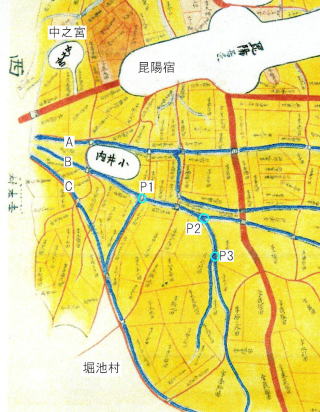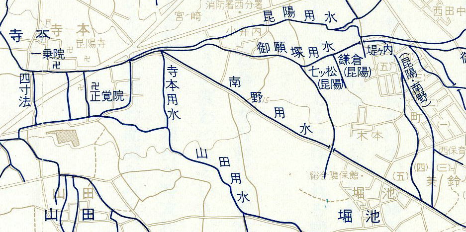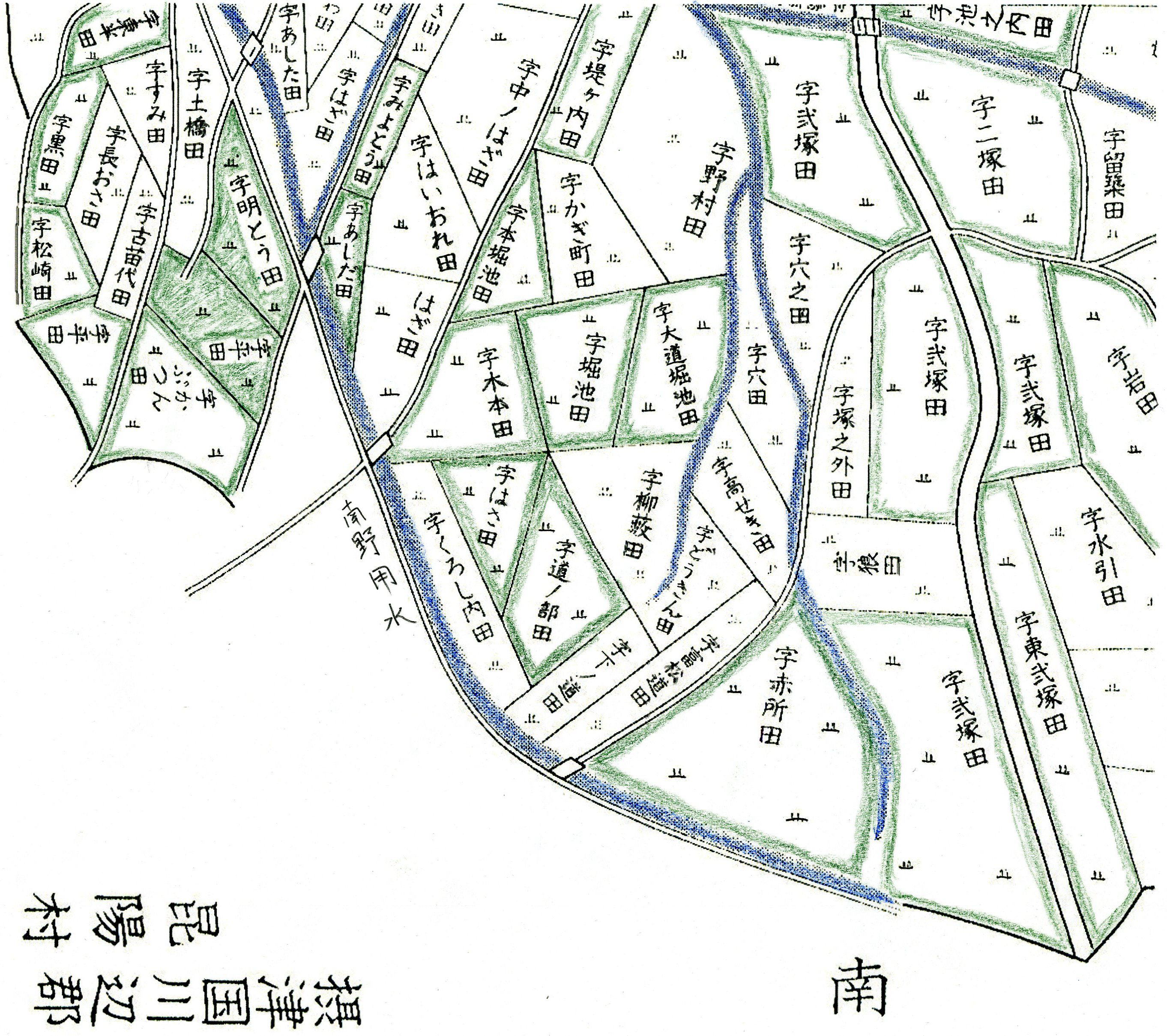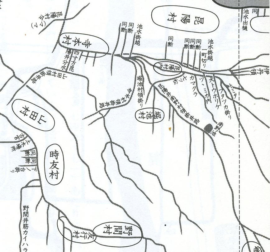 堀池村字ミヨト地区から昆陽村字平田地区の田を潤していたと考えられる。