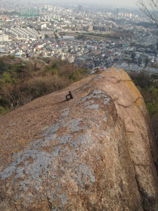 甲山八十八ヶ所の第62番から東を見ると、何やら大きな岩がごろごろしている。 このあたりはすっかり住宅地になってしまったが、古い文献には「目神山の岩場」という文字が出てくる。ここは、おそらく昔の目神山ボルダー群の名残であると考えられる。 |