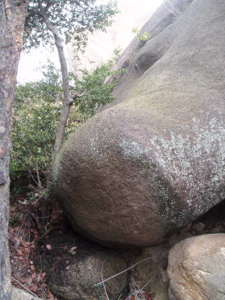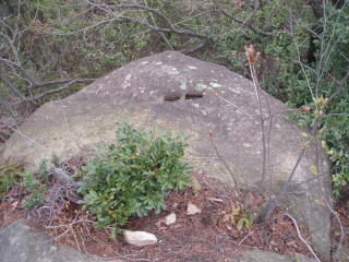 | ボルダー N2 岩には矢穴があり、このあたりが石切り場であったことがわかる。ボルダーN1の次に大きなボルダーである。 場所:ボルダーN1の西隣 |
