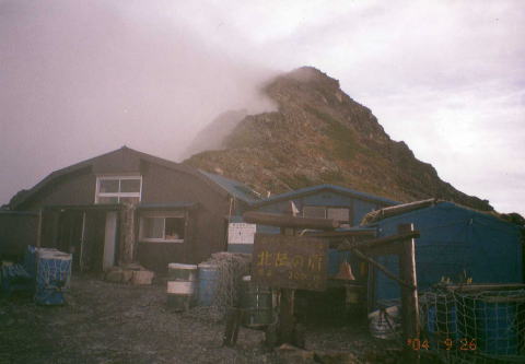 6:45登山開始。天気予報では9月26日〜28日は、『全国的に晴れ』とのことであったが、予報は大きくはずれた。日本列島を通過するべきはずの秋雨前線が居座り、台風21号の北上に重なって天候は悪化の傾向にあった。しかし、登山を取り止めるほどの荒れ方でもなさそうなので予定通り進むことにした。北岳を目指す多くの登山者に混じって、大樺沢を遡る。二股を過ぎたあたりからガスがひどくなり、小太郎尾根に近付く頃には小雨となった。肩ノ小屋11:20着。ずいぶん早めだが、予定通り今夜はここに泊まることにした。夕方、少しの間だけガスがはれ、写真を数枚とった。
