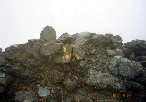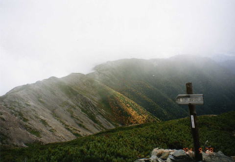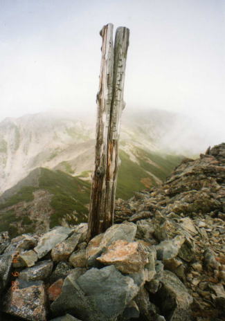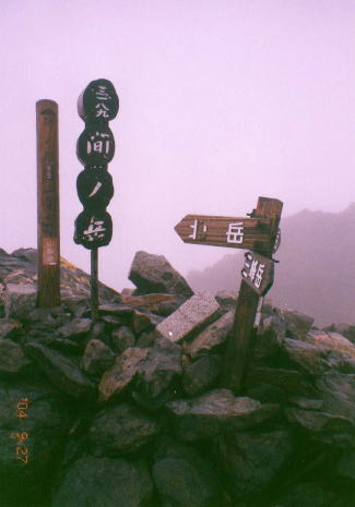 ガスは濃かったが、雨はやんでいた。5:40農鳥小屋を出発、西農鳥岳6:30着。西農鳥岳は農鳥岳の属峰のように見なされているが、その標高は3051mで農鳥岳の3026mより高い。それなのに、標識も何もなく、殺風景で少しかわいそうな気がする。