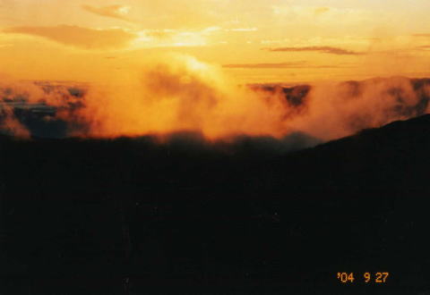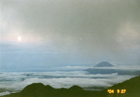 農鳥小屋から見る夕焼けは、私がかって見たことがないものだった。西の中央アルプスの稜線に沸き立った巨大な雲の中で、太陽が茜色に燃える。と同時に、東からは富士山の左側高く、灰色の空に満月が忽然と姿を現す。まさに蕪村の『月は東に日は西に』を地で行く幻想的な光景であった。
