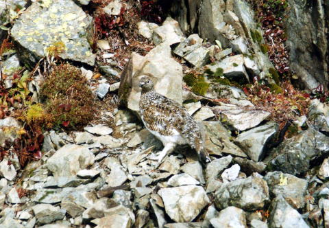 大門沢下降点の手前で、雷鳥の親子に出会った。ひょこひょこ歩く姿は、いつ見ても愛らしい。大門沢下降点8:40。空は晴れ、広河内岳の山頂の標柱がくっきりと見える。広河内岳は、大門沢下降点から約1時間でピストンできる。山頂からは、最近脚光を浴びている白峰南嶺のなだらかな連山が見渡せた。