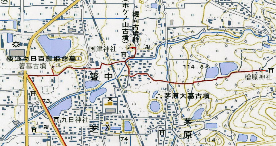 檜原神社から九日神社への道筋にはホケノ山古墳・箸墓古墳等の有名な古墳があるので、時間が許せば寄ってゆきたい。豊鍬入姫命の墓との伝承が残るホケノ山古墳はのどかな風景が楽しめる。また、卑弥呼の墓との説もある箸墓古墳は池側からの眺めが素晴らしい。