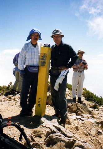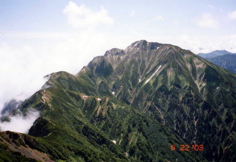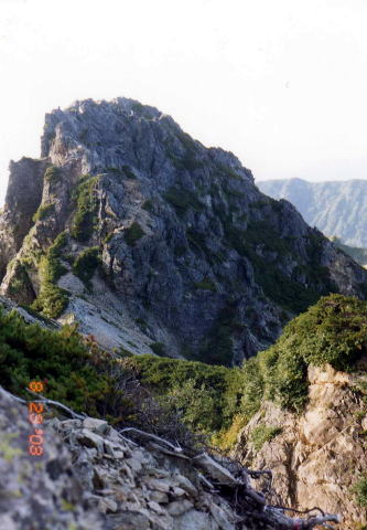 12時15分、鹿島槍頂上(2,890m)、ここで、私達の白馬〜鹿島槍の縦走は実質的に終了する。西には堂々とした軍艦のような剣岳が正面に聳え、南には布引岳・爺ケ岳・種池と続くなだらかな緑の稜線が伸びている。冷池山荘から登ってきた多くの登山者に混じって昼食をとった後、12時45分、種池山荘に向かって下山を開始。縦走のこころよい満足感をゆっくりと味わいながら下る。ハイマツの緑が目にしみる。