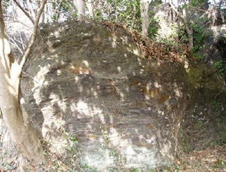台地の中腹には粘板岩の巨石が存在する。(左記コメント参照)