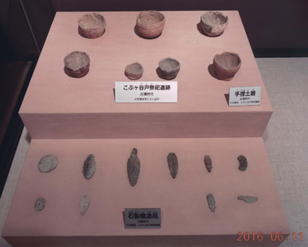 美里町遺跡の森館の展示物 上:手捏土器 下:石製模造品