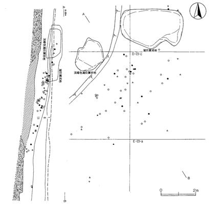 本遺跡は、南北15m、東西10mの大きさの楕円形を呈する遺構で、緩やかな斜面に存在し、約220点の遺物が折り重なるように堆積していた。遺物は、第11図中の2つの岩(凝灰質泥岩、凝灰質砂岩)の南側で特に集中して検出されている。
