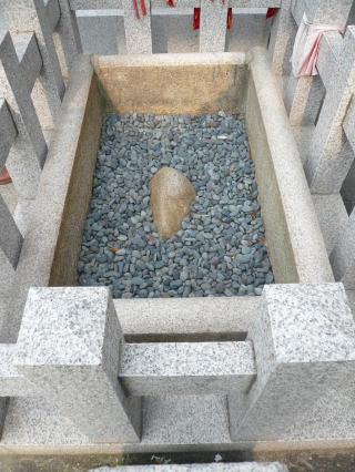 石の鳥居をくぐるとすぐ右側に玉垣で囲まれた「引導石」と呼ばれる聖石がある。