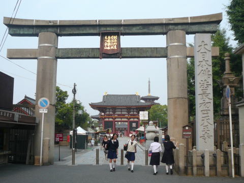 四天王寺(してんのうじ)は、大阪市天王寺区にある寺院で聖徳太子建立七大寺の一つとされている。『日本書紀』によれば推古天皇元年(593年)に造立が開始されている。山号は荒陵山(あらはかさん)、本尊は救世観音(ぐぜかんのん)である。 寺の周辺の区名、駅名などに使われている「天王寺」は四天王寺の略称である。 宗派はもと天台宗に属したが、日本仏教の祖とされる聖徳太子建立の寺であり、「日本仏教の最初の寺」として、既存の仏教の諸宗派にはこだわらない全仏教的な立場から、1946年に和宗総本山として独立宣言を出している。 |
