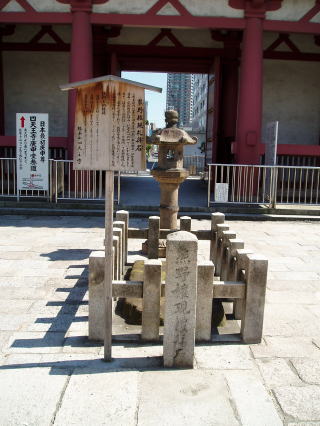 | 図8 四天王寺の石の鳥居、向こうに見えるのは極楽門 鳥居の右内側に引導石そばの石塔が見える |