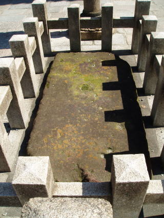 この石はもと東門外(門の階段のすぐ下)にあったものを、明治年間に門内に移したとある。(奥田1961A,生田1910)