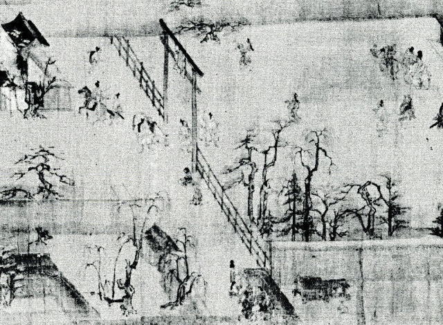これに関して、鎌倉時代の西の鳥居の付近を最もよく写し取っているものに一遍上人絵伝(下注参照)がある。図11はその絵伝で、鳥居の付近には引導石が見当たらないことがわかる。さらに現在の石の鳥居は、当時は木の鳥居であったこともわかる。