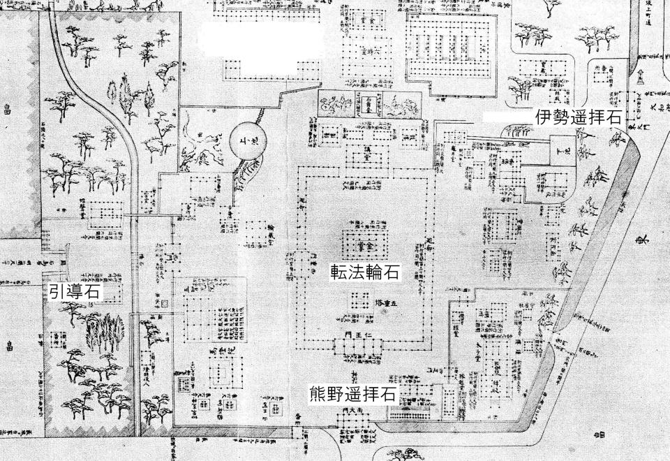 | 図2 元和再建後の四天王寺伽藍図(上が北)(天沼1936) 金堂前 「転法輪石」 西門 ・石の鳥居横 「引導石」 南門 「熊野遥拝石」 東門 「伊勢遥拝石」(元和再建後の四天王寺伽藍図には記載なし) |