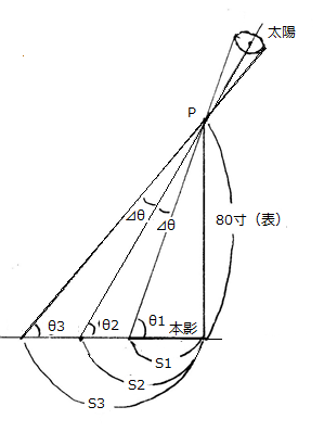 S3=80 / tanθ3(半影 太陽の下端に対応 影は最長)