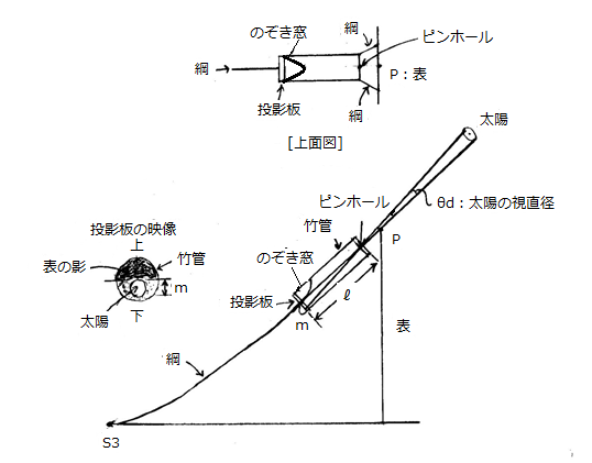今、θd平均的視直径32′=0.53°の時、投影板に写る太陽の大きさm は、竹管の長さℓ の0.93%となる。