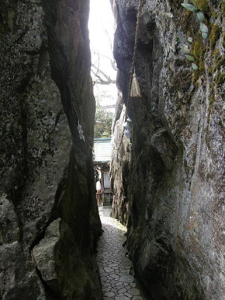 | 夫婦岩の本殿に通じる狭い通路 | 本殿側から見上げた夫婦岩 |