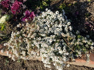 スイートアリッサムは、白くて小さなお花がぎゅっと集まって、まるでふわふわのじゅうたんみたいに見えるよ。