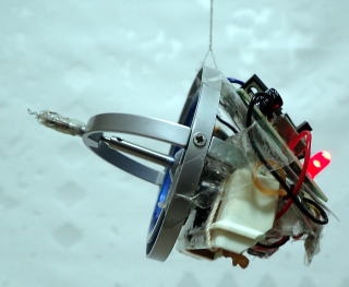 尚、回転板を右回転させたコマの実験では、はかりの目盛りのプラス、マイナスは逆となり、 歳差運動の向きへのコマの回転移動はやはりポテンシャルの増大をもたらす結果となる。 実験4 ゴム糸の張力と歳差運動の角速度との関係 実験装置を使った実験1の途中において、ゴム糸を指でつまんで少し緩めると、 歳差運動は右回転から左回転となる。 ゴム糸を上下に変化させると、歳差運動の回転向きを左右に変えることができる。 さらに糸巻取り用ドラムを使ってゴム糸の伸縮を微調整すると、 ゴム糸の張力に応じて歳差運動の角速度をコントロールできることがわかる。 <検討> Ω=Mt/Lsinθ=Mt/Iωsinθ(6式)のモーメントMtは、ゴム糸の張力と重力の合成である。 Mtが大きくなると歳差運動の角速度Ωも増大し、小さくなると減少することがわかる。 そして、ゴム糸の張力が重力に打ち勝つと歳差運動は右回り、負けると左回りになる。 さらに等しい時には停止する。 (注)前述のように、月や太陽が地球に及ぼす偶力は周期的に変化している。 ここでは、この偶力に相当するのがゴム糸の張力である。 このため地球の歳差運動は、周期的に早くなったり遅くなったりを繰り返しながら 右回転していることになる。 一般に言われている歳差運動の角速度50″/年は、この平均の角速度である。 実験5 歳差運動の角速度Ωの加減速 図8の実験装置において、細い棒状のもので歳差運動を軽く加速する形で コマの回転軸の先端を右に回してやると、コマの軸は下降する。 逆向きに歳差運動を軽く抑制してやるとコマの軸は上昇する。 次に、歳差運動を強制的に停止させると、 棒に沿ってコマが上昇(通常のコマでは落下)してゆくのが観察できる。 <検討> 本実験は前の実験3の継続である。 歳差運動の角速度Ωが増大すると、ジャイロモーメントが増大しポテンシャルを獲得する。 逆も同様に考えられる。(注) ジャイロモーメントMgは、Mg=L×Ω (10式)である。 歳差運動の強制的な停止についてはⅠコマのアナロジー5で説明したおりである。 尚、通常のコマにおいては、歳差運動を加速する向きは回転軸の上昇、 減速する向きは下降をもたらすことになる。 (注)Ωはコマの上下運動と密接な関係があり、これはコマの章動と呼ばれる。 詳細については末尾の文献1と関連サイトを参照されたい。 この原理は地球にもあてはまり、月や太陽の引力が歳差運動を加減速する方向に 作用するときに章動が発生する。 Ⅲ 理科教具 角運動量制御型電動地球ゴマ 1 角運動量制御型電動地球ゴマの試作 渦巻き運動のⅡの実験1において、変化しているものと言えばコマの回転数である。 ならば落下現象の時間を巻き戻して考えると、 コマの回転数の持続的な増加dω/dt>0によって コマは上昇するのではないかとの推定がもたらされる。 角運動量制御型電動地球ゴマは、この素朴な発想をもとに試作したものである。 実験装置の全体構成は図8と同じとする。 <部品一覧> 地球ゴマ SGジャイロスコープ ディスク直径6cm 調達先 Amazon リモコン送受信機(ラジコンカー用) Perfk Receiver Set for Kids 受信機15g 中国製 調達先 Amazon モーター ミニ四駆用ハイパーダッシュモーター3 定格3V 17g 変速用歯車 ミニ四駆用TAMIYA AO-1032 調達先 模型店 モーター駆動用電池 LP503040 3.7V充電式リチウム電池 600mAh サイズ40×30×5mm フル充電4.2V 調達先 Amazon 使用上の注意は下記参照 <予算> 地球ゴマ 4200円 その他の部品一式 約4000円 ![]() 図10 角運動量制御型電動地球ゴマの実験装置 左 リモコン送信機 右 地球ゴマ 重量135g 外形7cm <モーター駆動用電池について> 電動地球ゴマの電池は、小型軽量で強力なパワーを必要とする。 そのため、本電池の使用にあたっては、電池内蔵の過放電防止保護回路をバイパスし、 モーター接続用の端子を取り付ける。 電池本体から出力された外側の端子にはんだ付けすること。(図11参照) はんだが付きにくい場合は、導電性アルミ箔粘着テープが意外と使える。